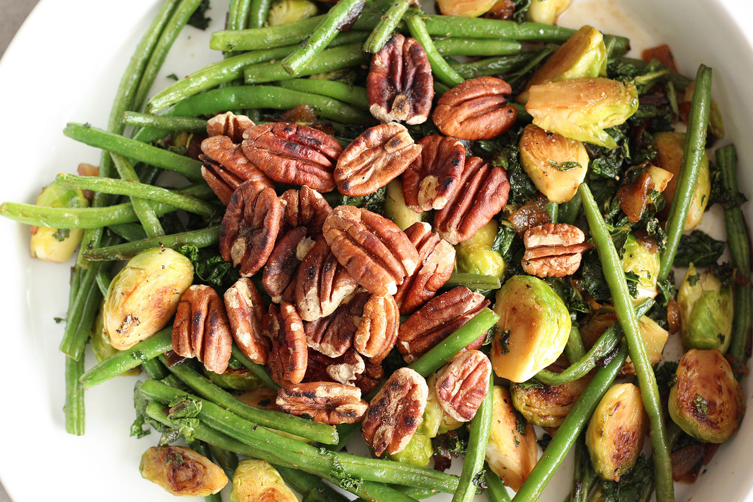 -I’m adding the vegetables to a serving dish, and topping them with the toasted pecan nuts