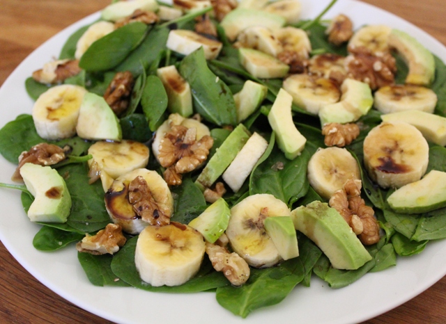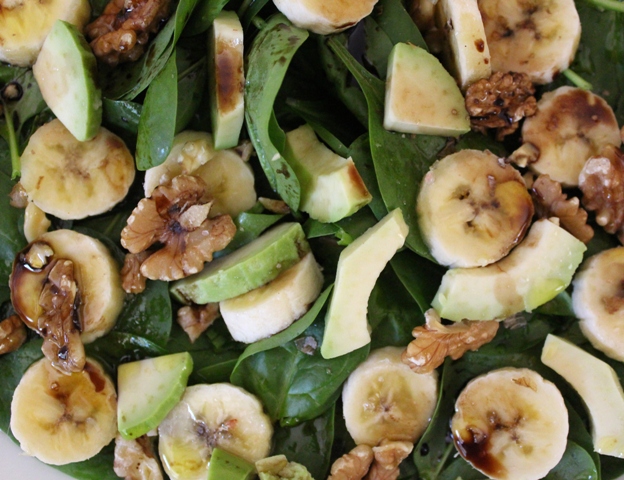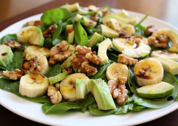 Sweet banana slices, creamy avocado and crunchy walnuts served on a bed of fresh greens and drizzled with an easy-to-make balsamic vinaigrette.