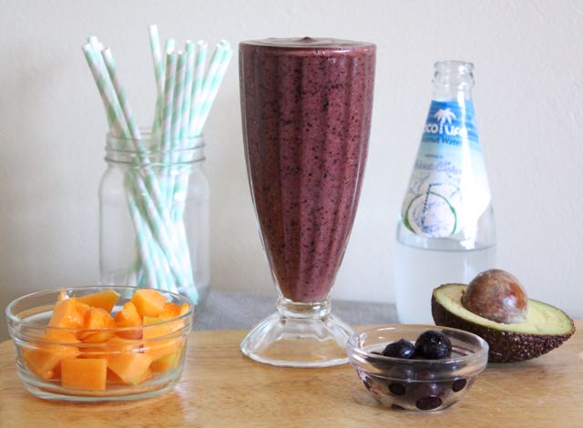 -blend the blueberries, melon, avocado and coconut water (or water) together until smooth