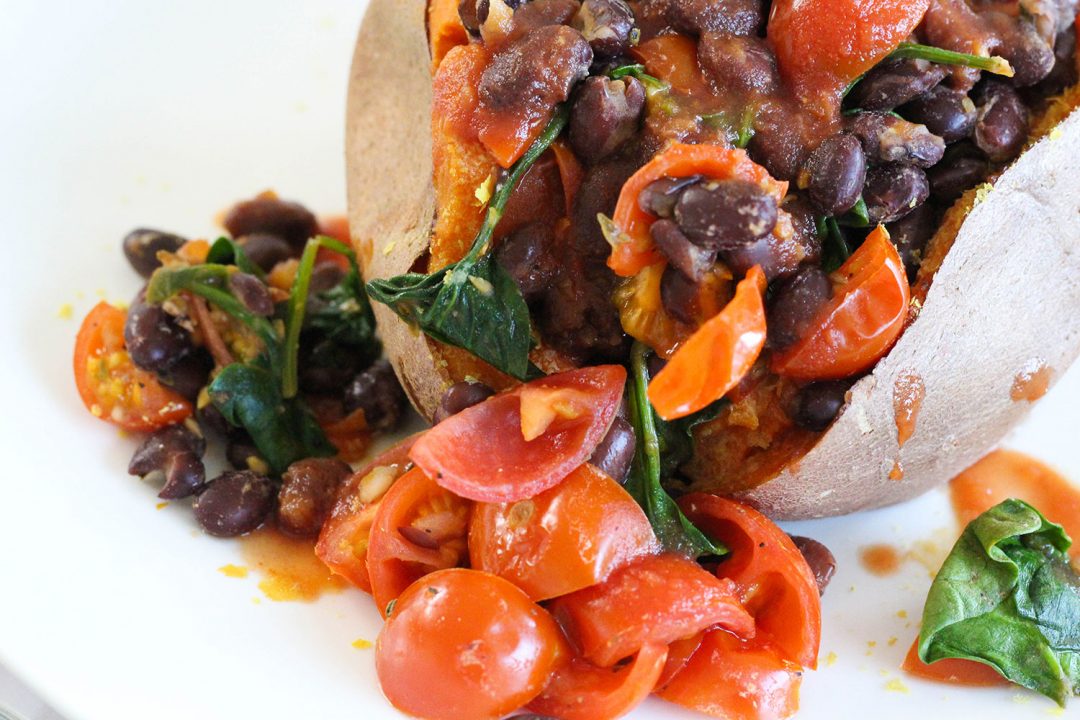 Stuffed Baked Sweet Potato w/ Black Beans & Salsa (gluten-free, dairy-free)