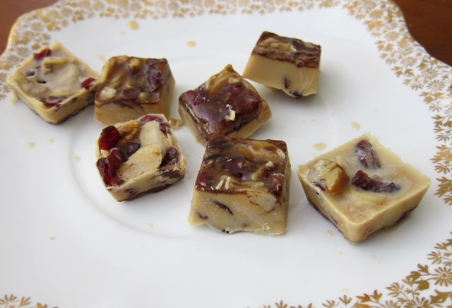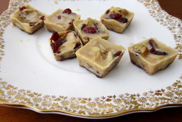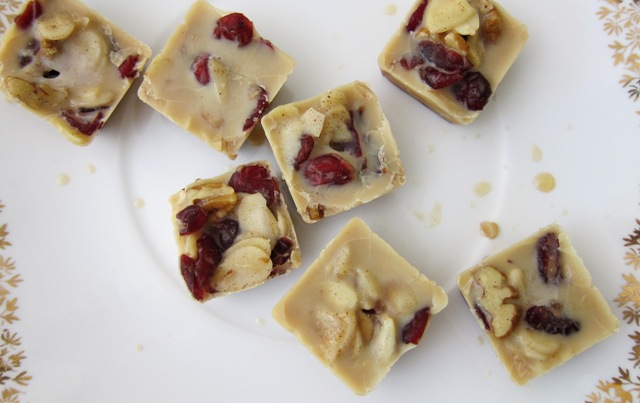 Mouth-watering, dairy-free maple white chocolate with dried cranberries, chopped pecan nuts, almond flakes and a sprinkle of cinnamon. The perfect, healthy, unrefined holiday treat!