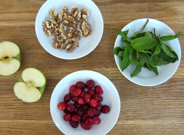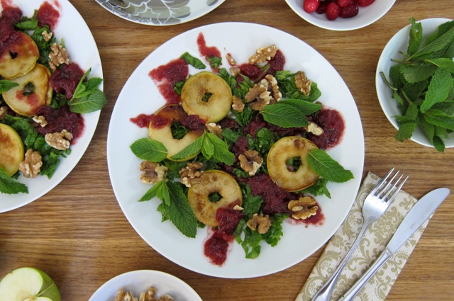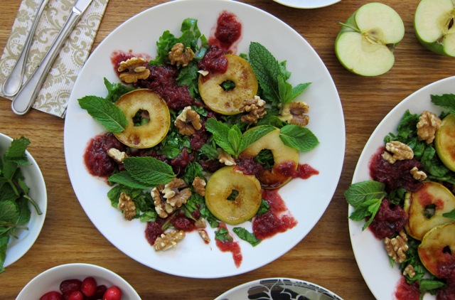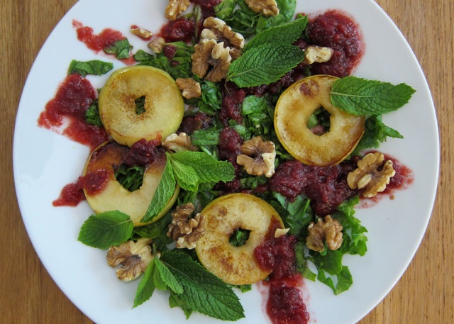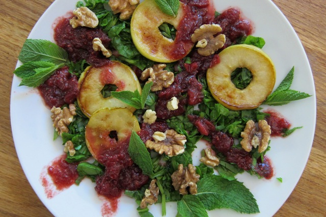Sweet, lightly sauteed apple rings with tangy cranberry sauce, fresh mint leaves and raw walnuts served on a bed of fresh, shredded baby spinach. YUM!