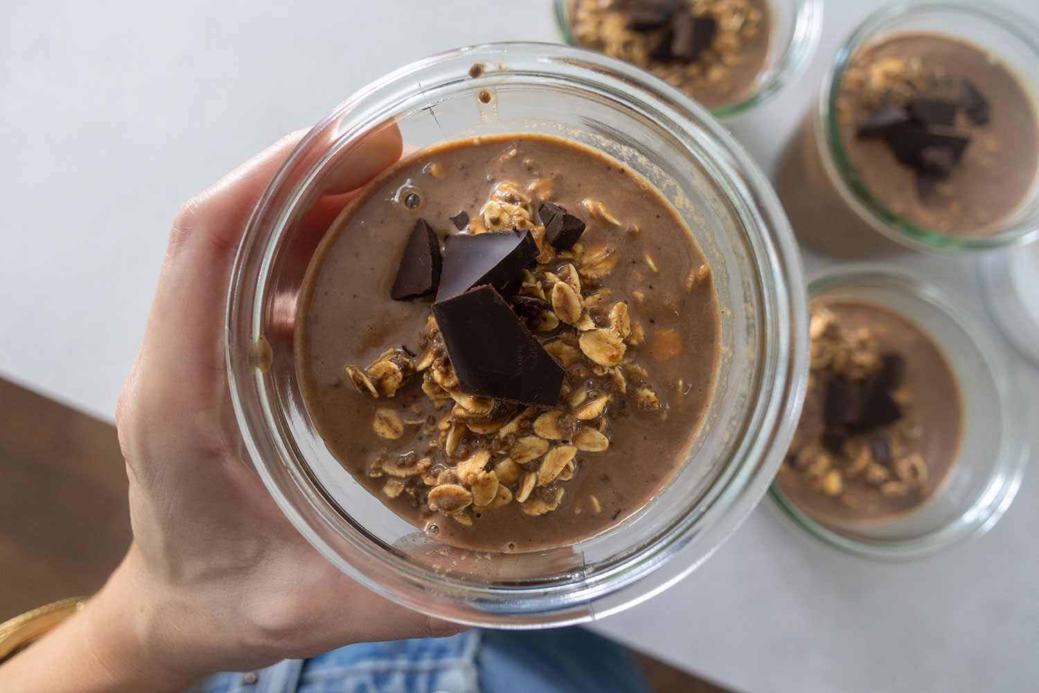1. At 0 minutes: Prep the overnight oats for breakfast, by mixing all of the ingredients together and storing in jars or containers with airtight lids (prep time: 10 minutes)