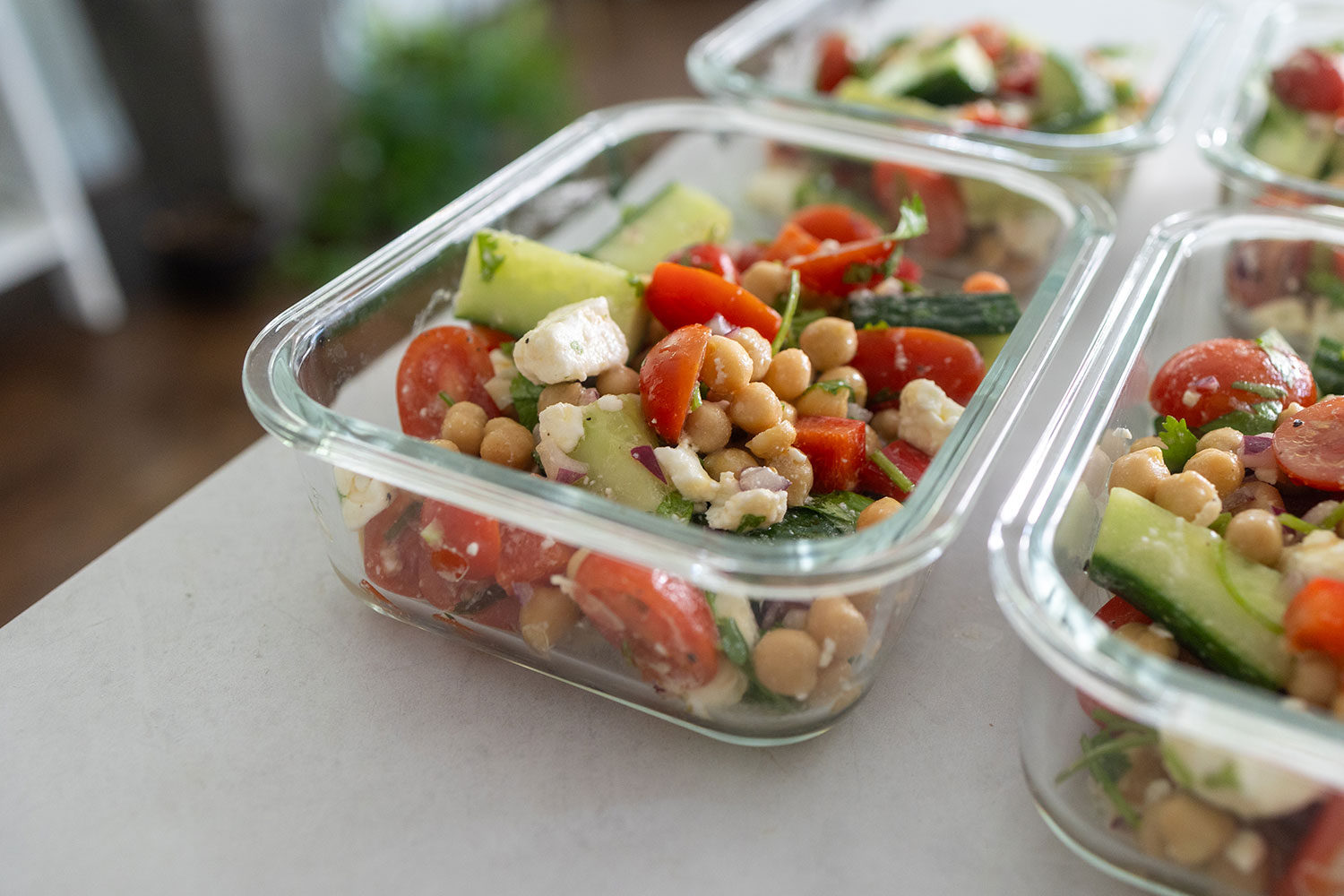 8. At roughly 35 minutes: Prep the salad by rinsing and chopping the vegetables and tossing with the drained chickpeas, feta (or vegan alt), oil, spices and flavorings before storing the salad between containers with airtight lids (prep time: 15 min)