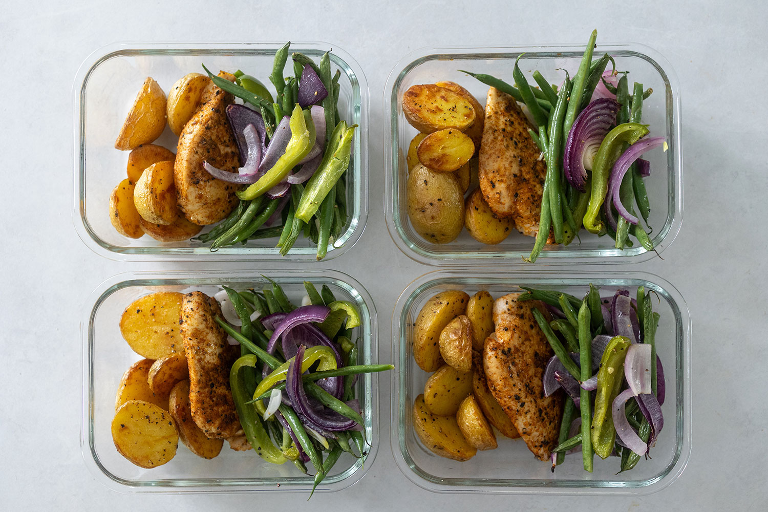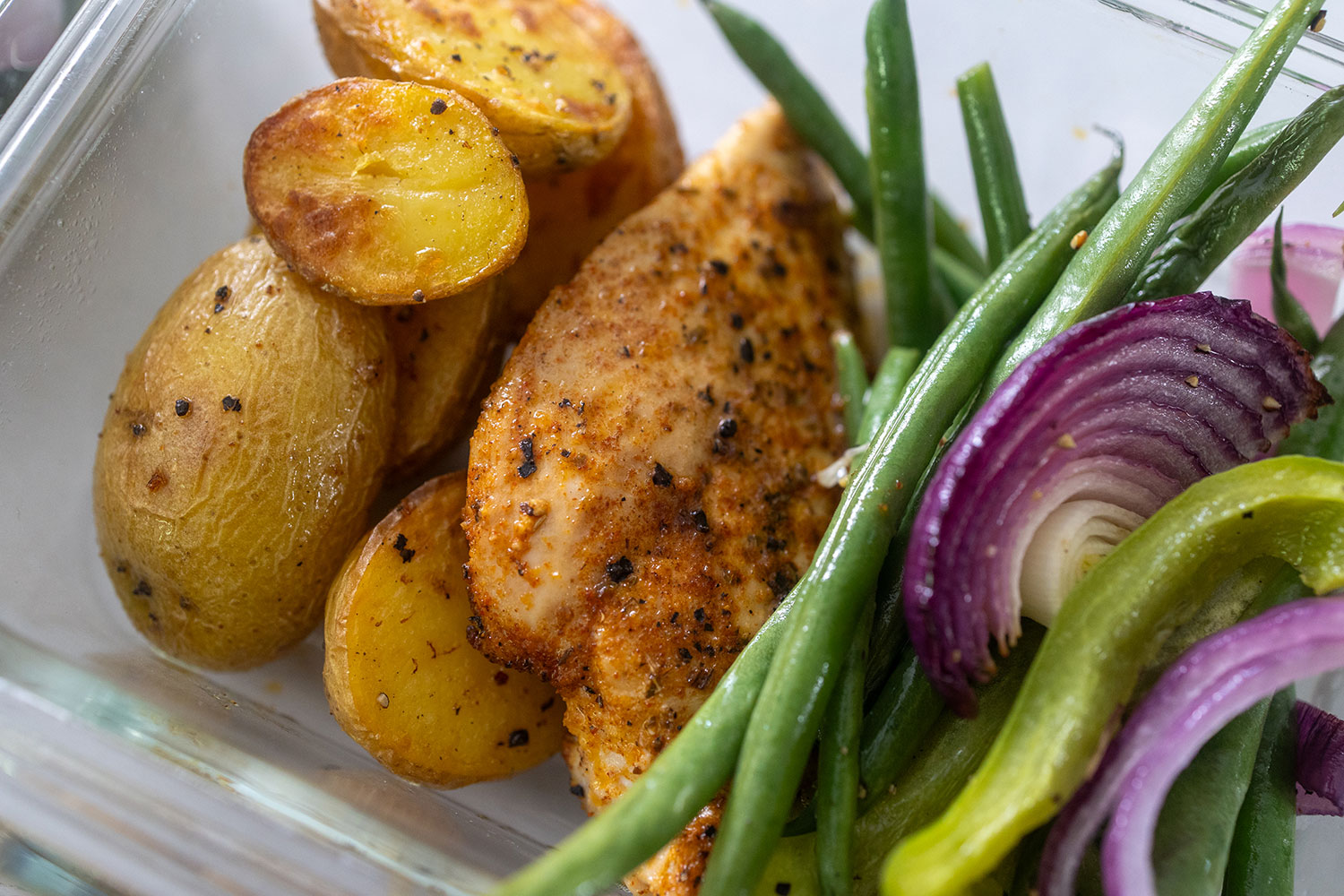 14. At roughly 55 minutes: Serve the cooked chicken, potatoes and vegetables between containers and cover them with airtight lids