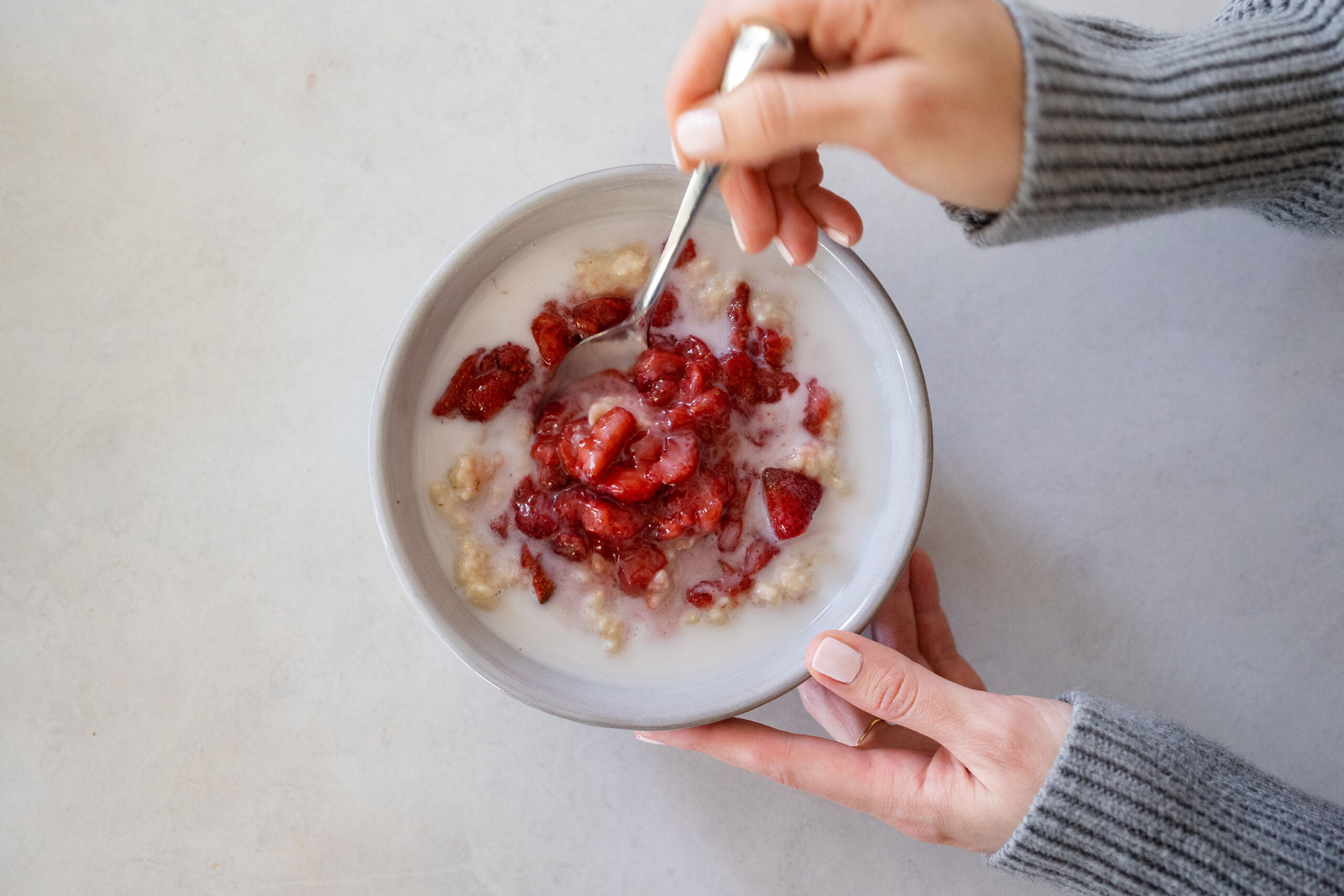 -Serve into a bowl, add the cooked strawberries on top, add the cream (I use light coconut milk from a can, and I like to drizzle it around the edge of the bowl so I can swirl the strawberries into it – see the video for reference).