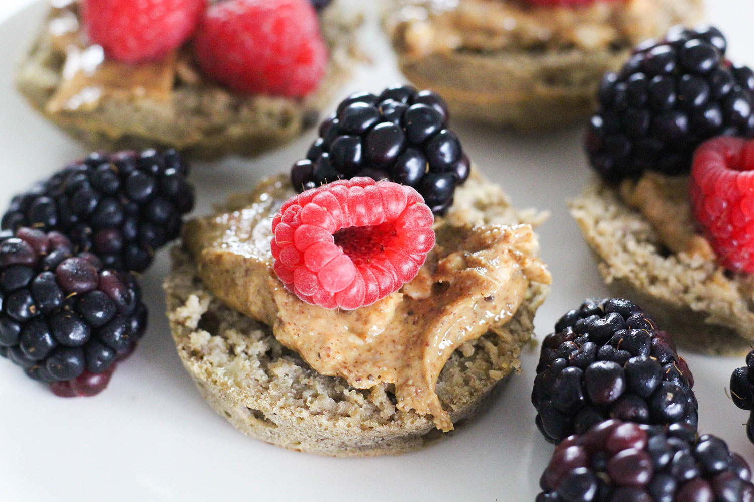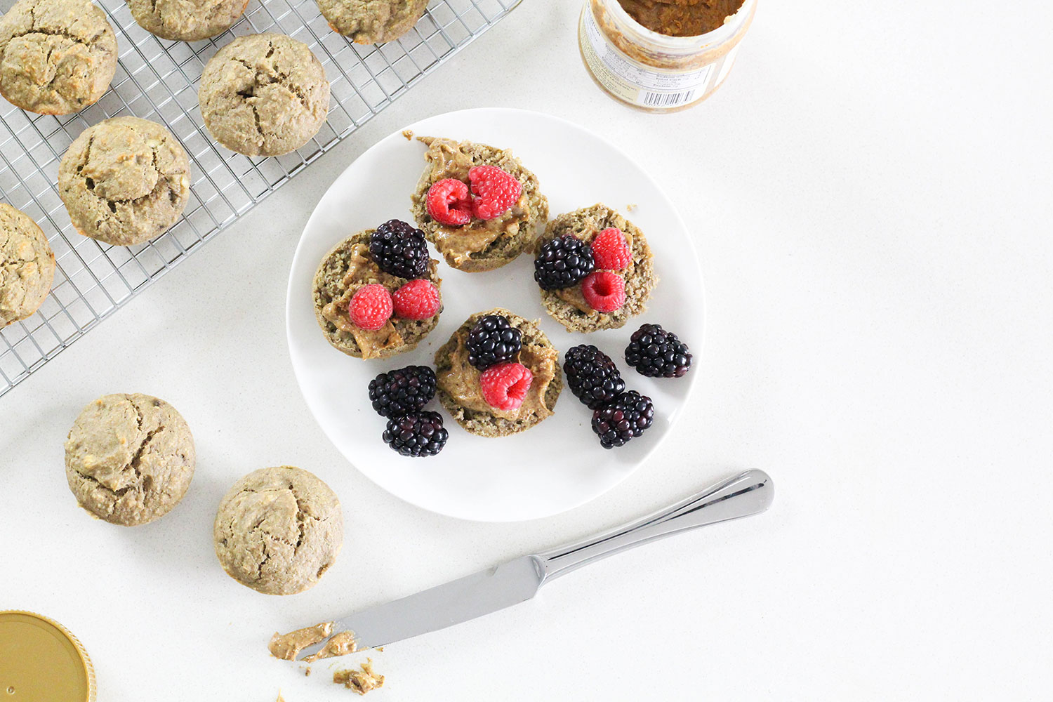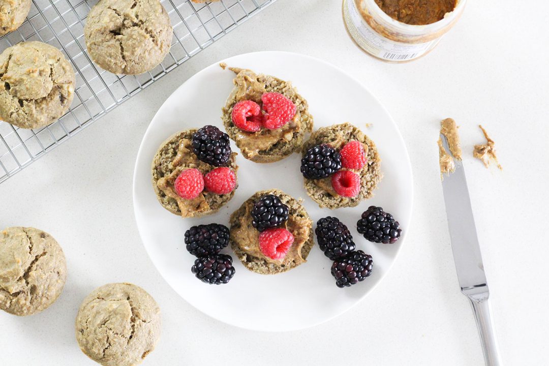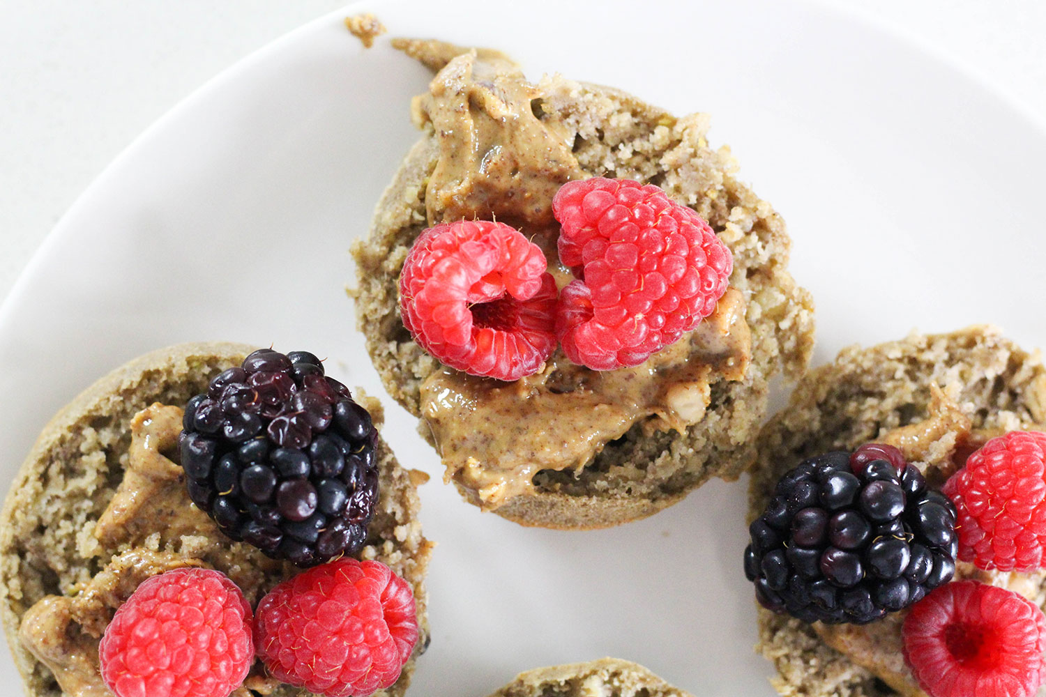 -I like to have 2 muffins for breakfast, which I slice in half, spread with almond butter and top with some fresh berries (they’re really good with banana slices too)