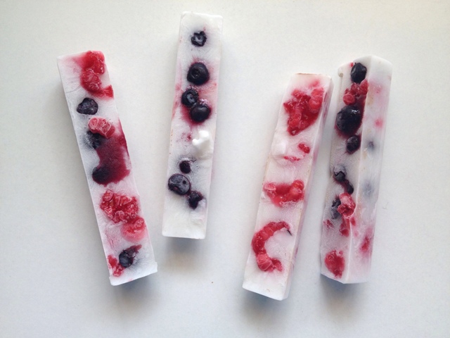 -add the frozen blueberries and frozen raspberries into the filled ice trays by popping them into the vanilla lolly mix