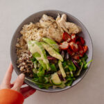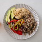 HOT CHICKEN + QUINOA BOWL: Quinoa, roasted chicken, roasted pepper + onion mix (+ accessories: olive oil, lemon juice, avocado)