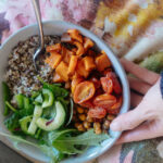 CHICKPEA + QUINOA BOWL: Quinoa bowl with quinoa, salad mix, roasted sweet potatoes, roasted chickpeas, roasted vinegar tomatoes (+ accessories: olive oil, lemon juice)