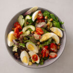 EGG + CHICKPEA SALAD: Salad with salad mix, roasted chickpeas, boiled eggs, vinegar roasted tomatoes + salad dressing