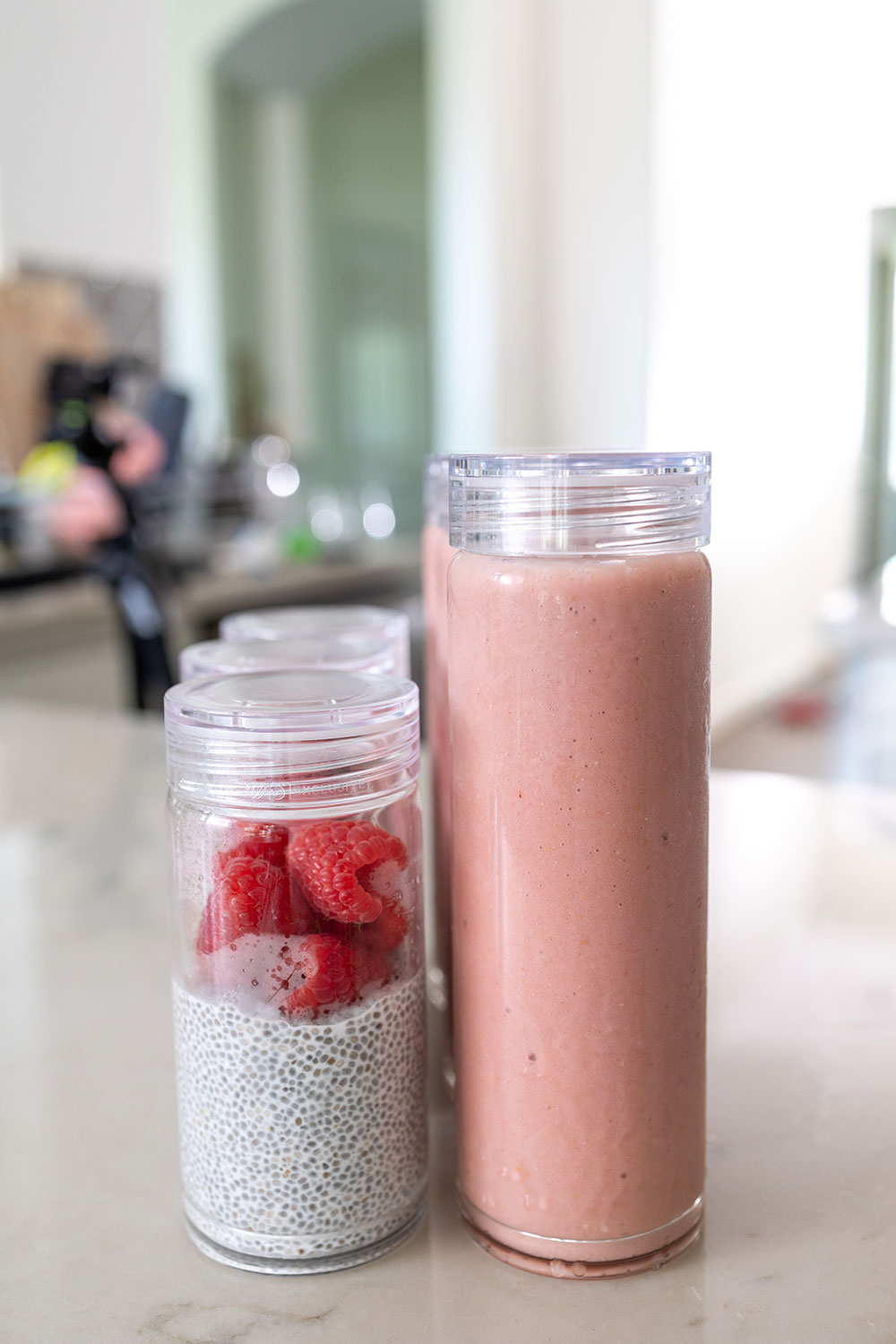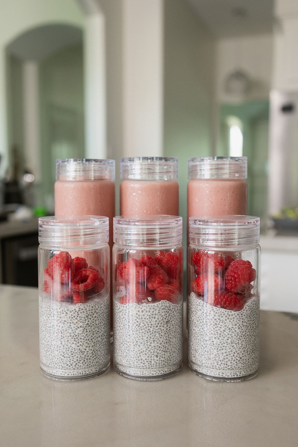 Chia pudding pictured with my strawberry & pineapple protein smoothies (which I prepped at the same time). Smoothie recipe in this post: https://liezljayne.com/easy-weight-loss-meal-prep-in-1-hour-high-protein-meals-healthy-snacks-for-the-week/