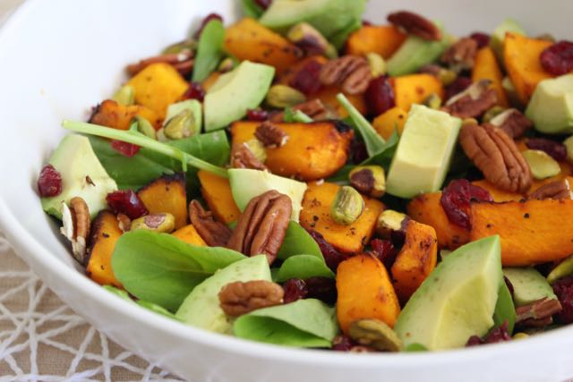 I made a Christmas salad last year which was a hit and so I really wanted to make another one this year – but a totally different one! The flavours of pumpkin, cranberry, pecan & pistachio are so dreamy together, and so when I tried this combination I knew that I had created my Christmas salad.
