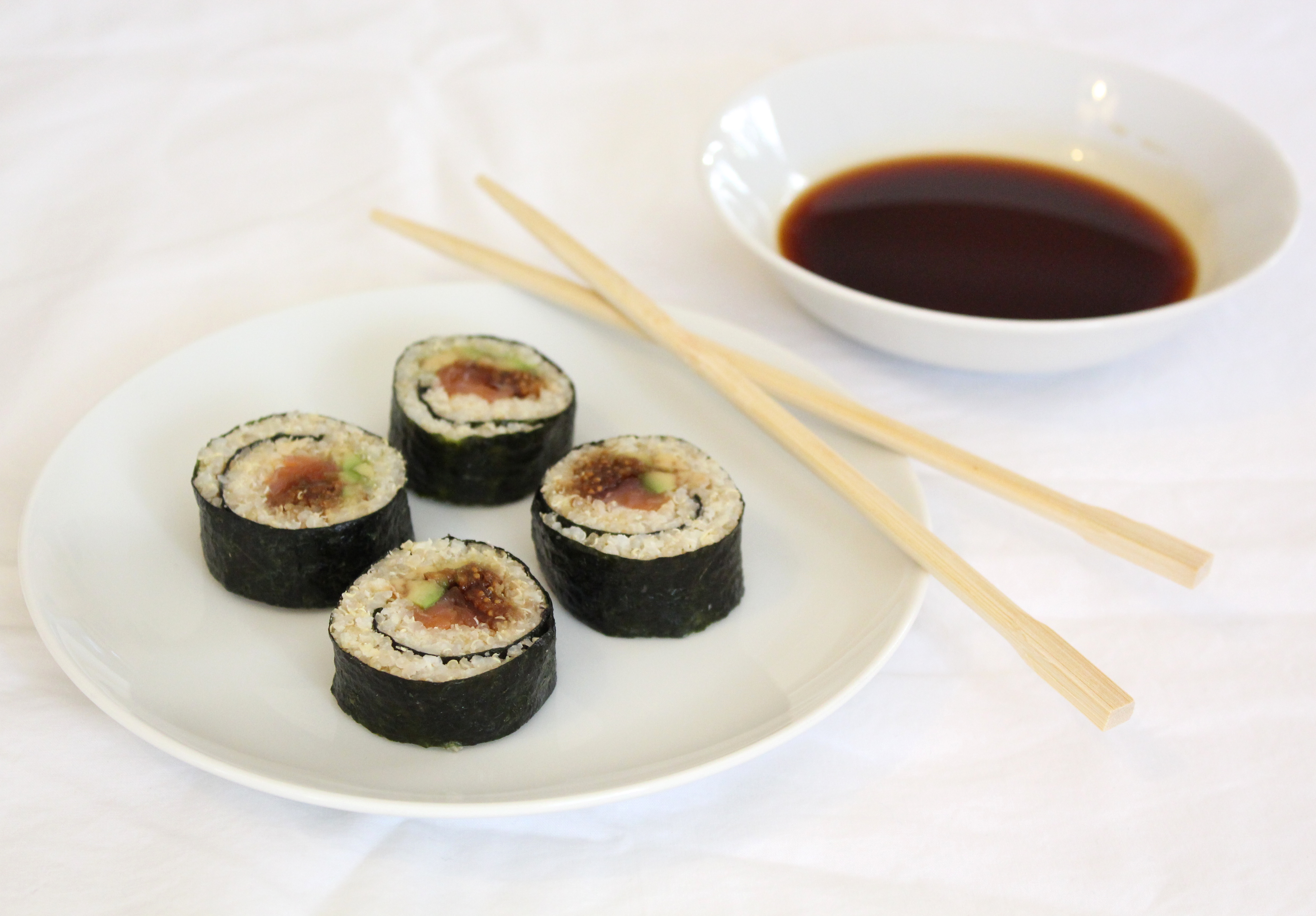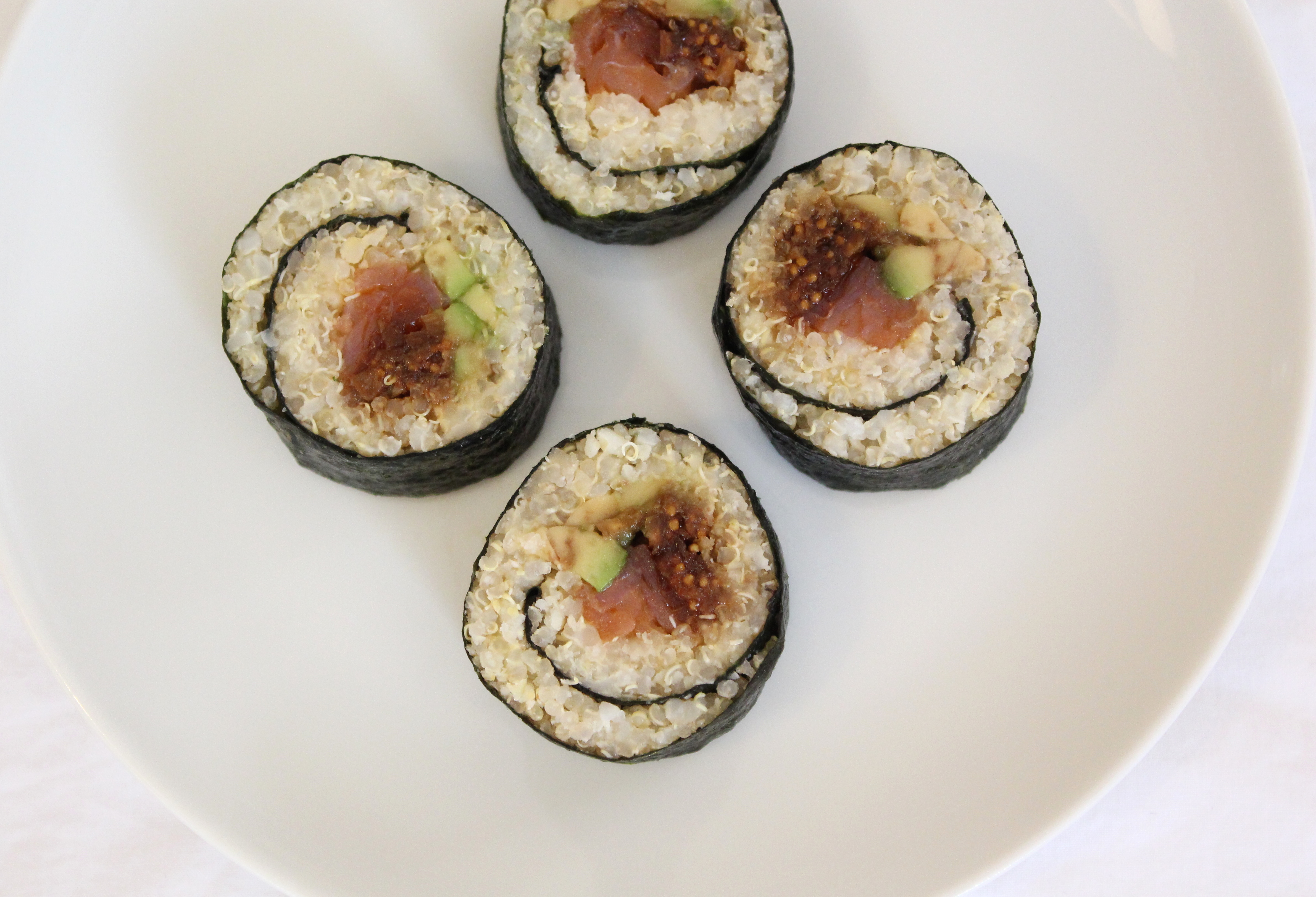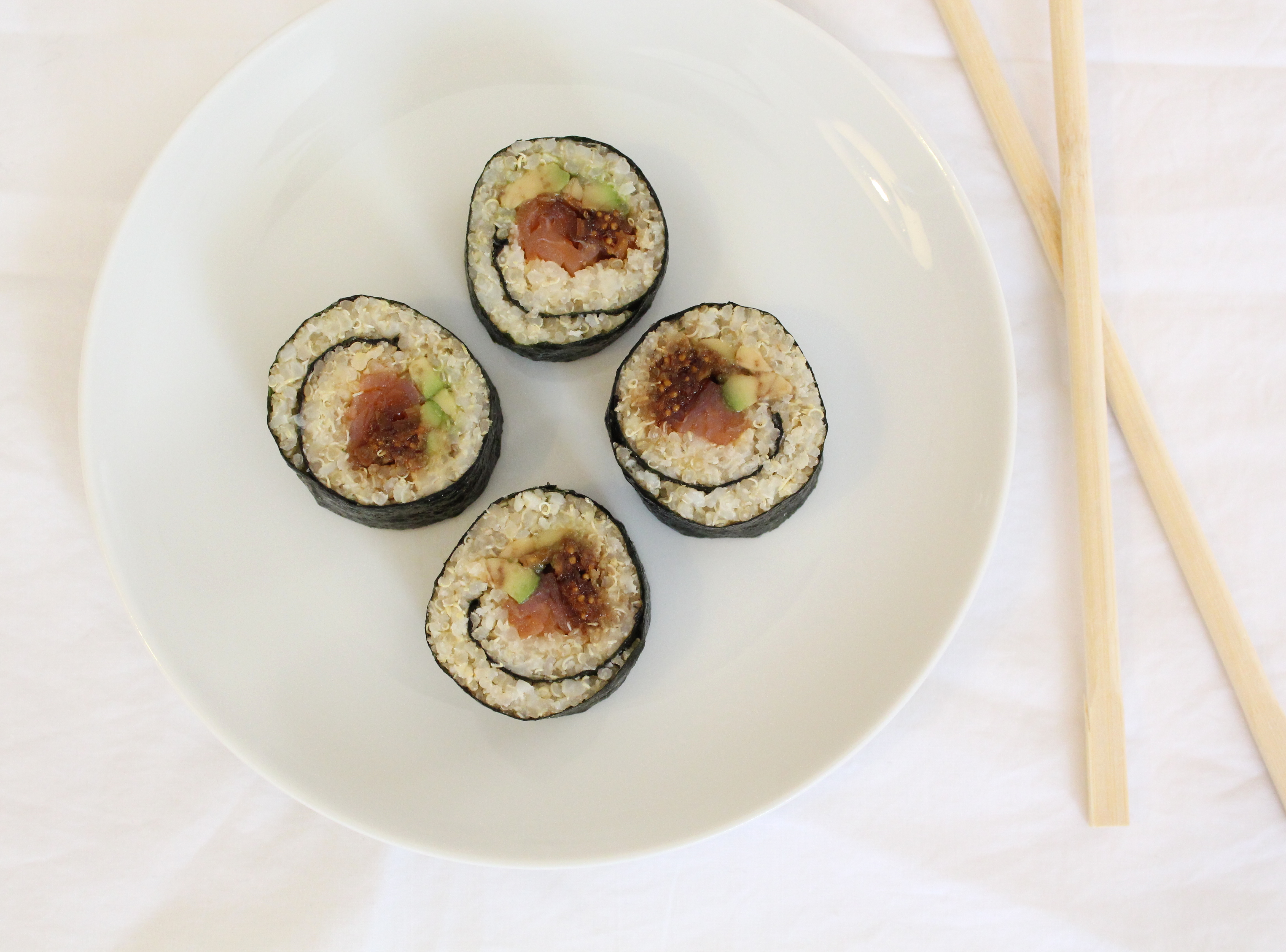Delicious quinoa & millet sushi rolls filled with dried fig, smoked salmon ribbons and fresh avocado slices.