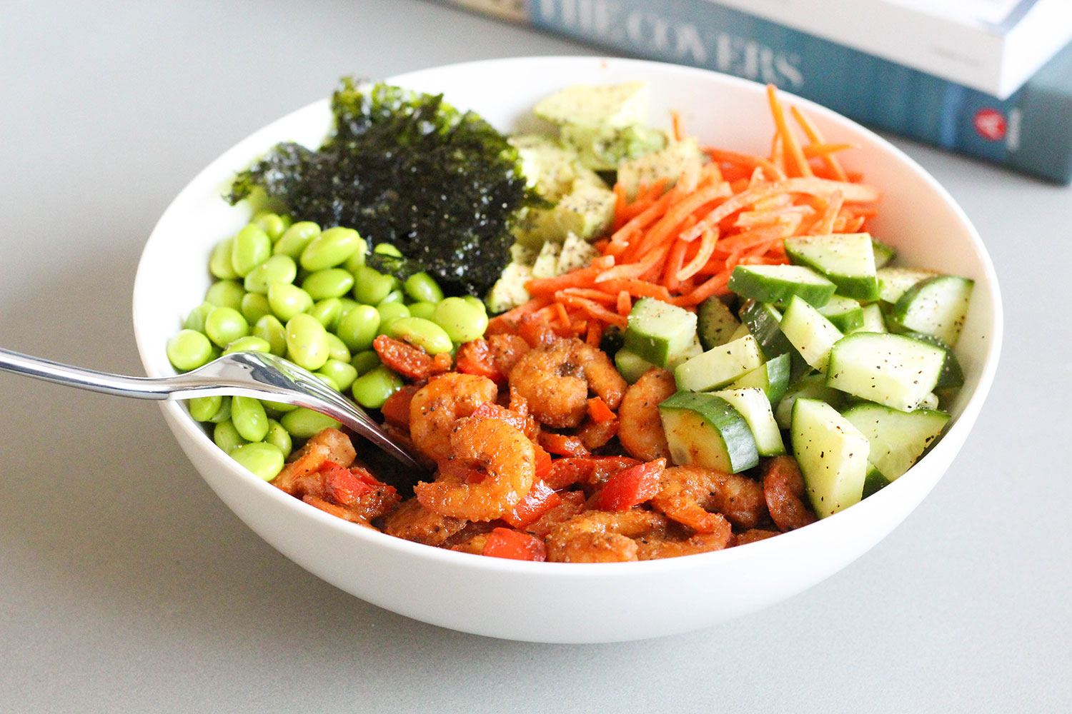This is a bowl full of good stuff! From edamame and shrimp which are high in protein, to avocado which is rich in healthy fats, to the various nutrients found in all of the fresh vegetables used. This recipe is not just a poke bowl, it’s a power bowl!
