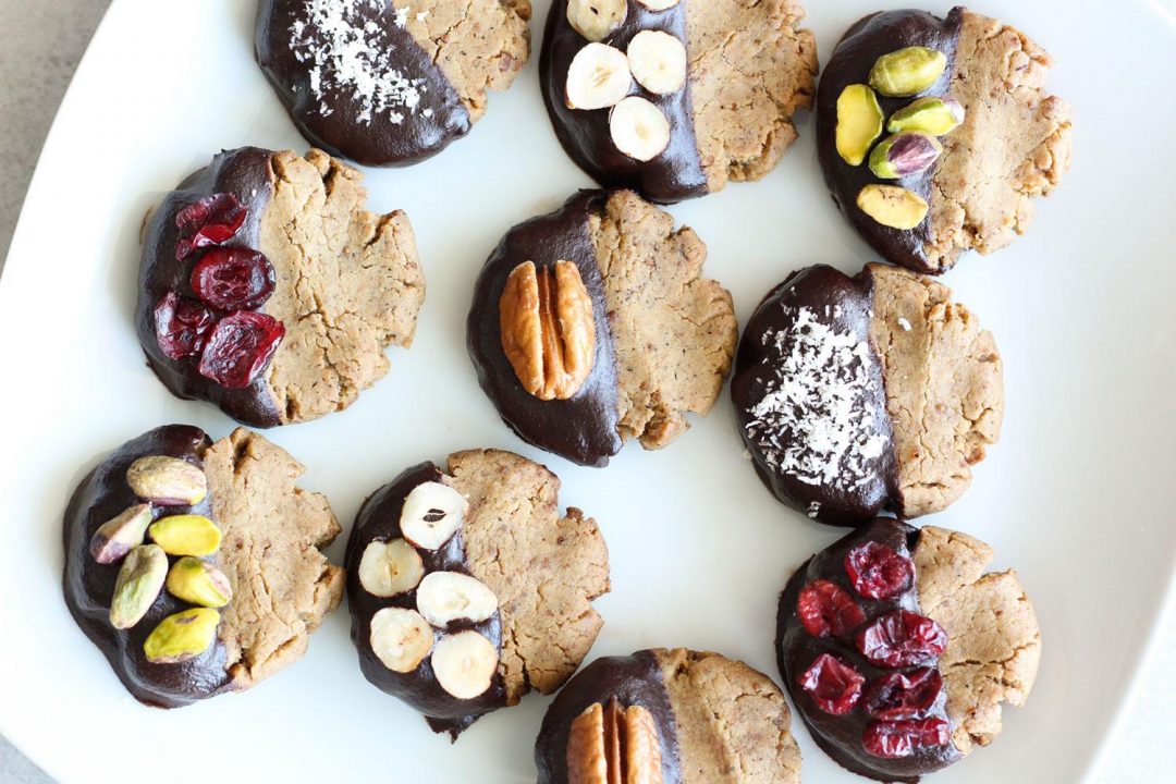*if you use coconut oil for the chocolate, the cookies will need to be kept in the fridge to avoid melting – however if you use cacao butter, the chocolate won’t melt at room temperature
