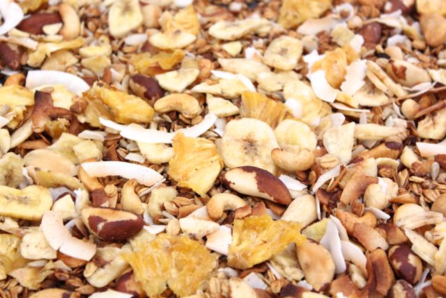 Brazil nuts, cashew nuts, coconut flakes, sunflower seeds, flax seeds and rolled oats golden toasted to perfection in a healthy, nutty syrup… mixed with dried pineapple and banana chips… absolute perfection!