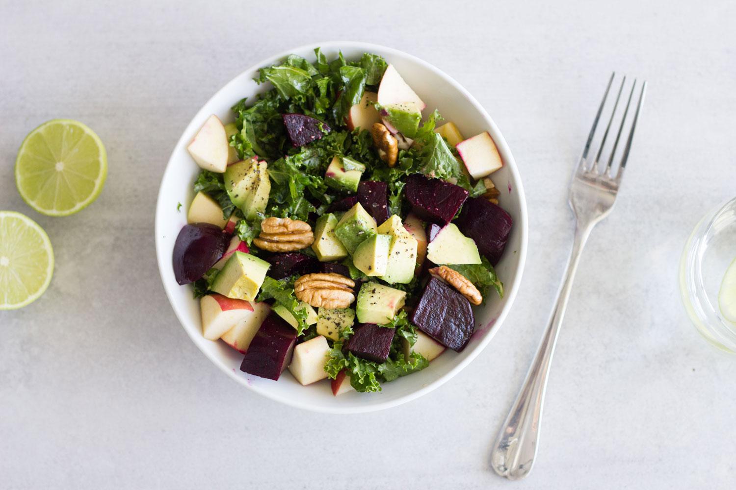 -add the chopped apple, raw pecan nut halves, roasted beetroot slices and 1/3 sliced avocado