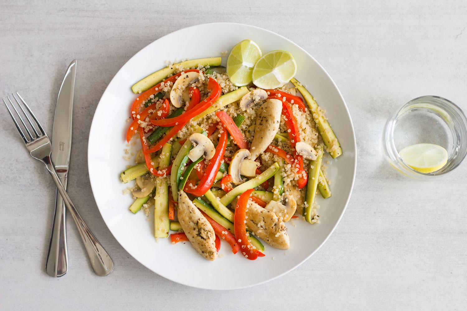 -once the chicken is almost fully cooked, add the red bell pepper, zucchini and mushrooms to the pan with a squeeze of fresh lemon juice
